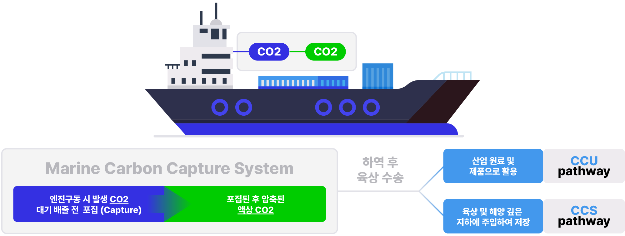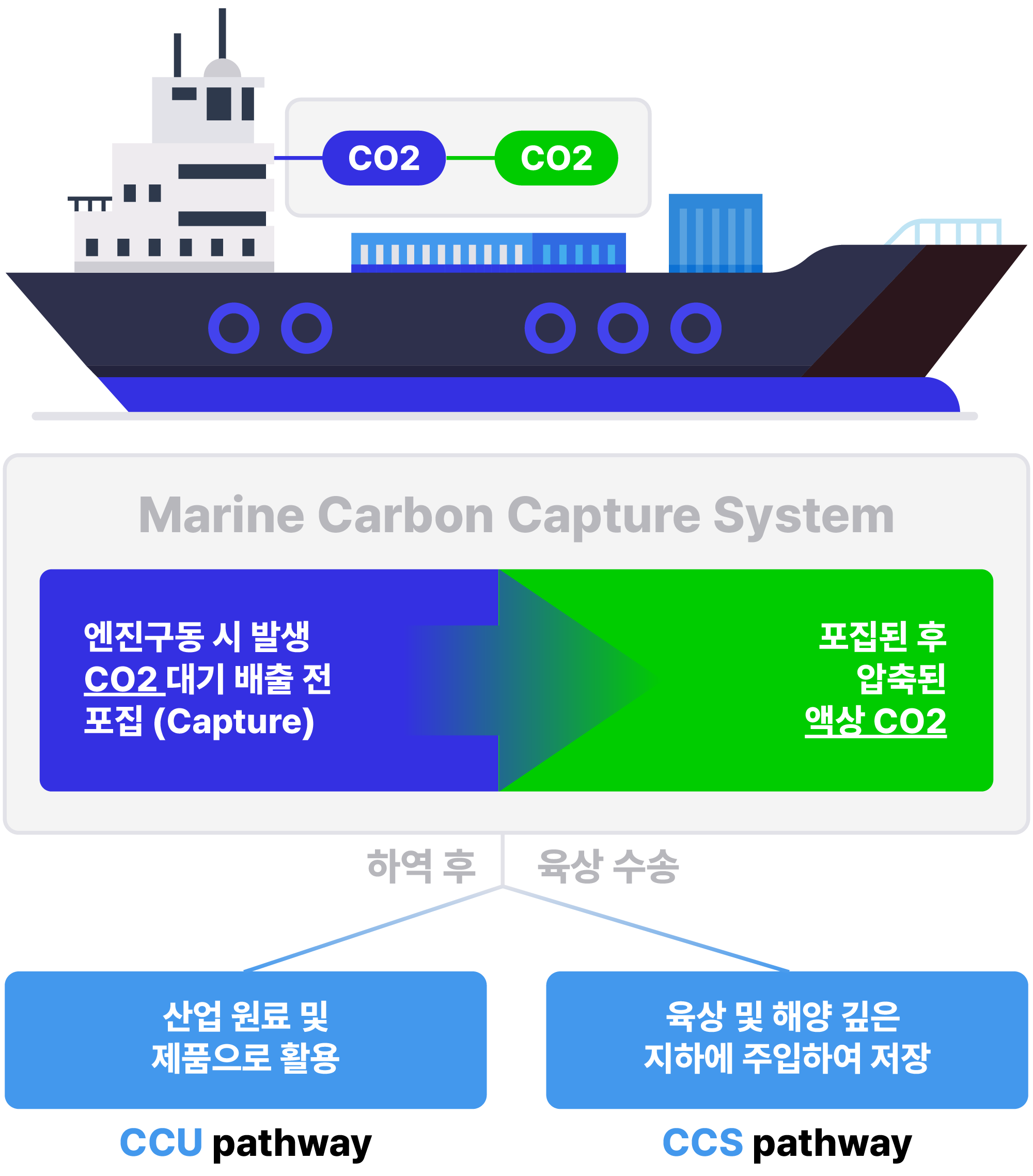 화석연료를 에너지원으로 사용하여 운항되는 선박에서 화석연료 연소로 발생하는 CO2를 대기배출 전에 포집(capture)하고,